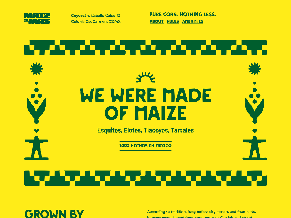 My task was to design a small business site for an iconic figure I’d spot in the city. Instead of choosing the logical artist/public figure subject, I chose Maize as my star because it’s ubiquitous in Mexico.